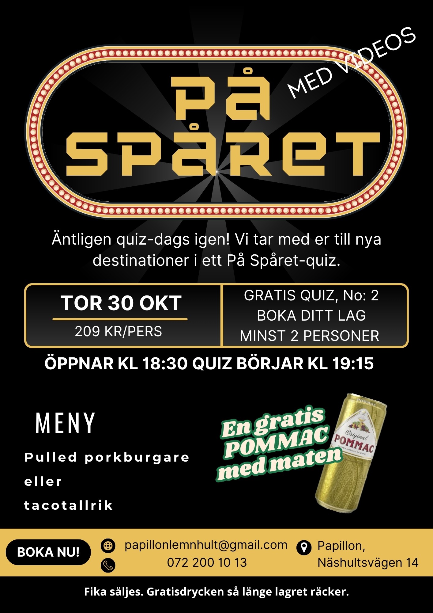 På Spåret-quiz på Papillon Café Boutique i Näshult Papillon välkomnar dig till en spännande På Spåret-quiz med god mat! Torsdag 30 oktober är det är dags för På Spåret-quiz. Vi dyker in direkt med tågresor till okända destinationer. Kom kl 18:30 för en måltid eller enbart till frågesporten som startar kl 19:15. Boka ditt lag […]